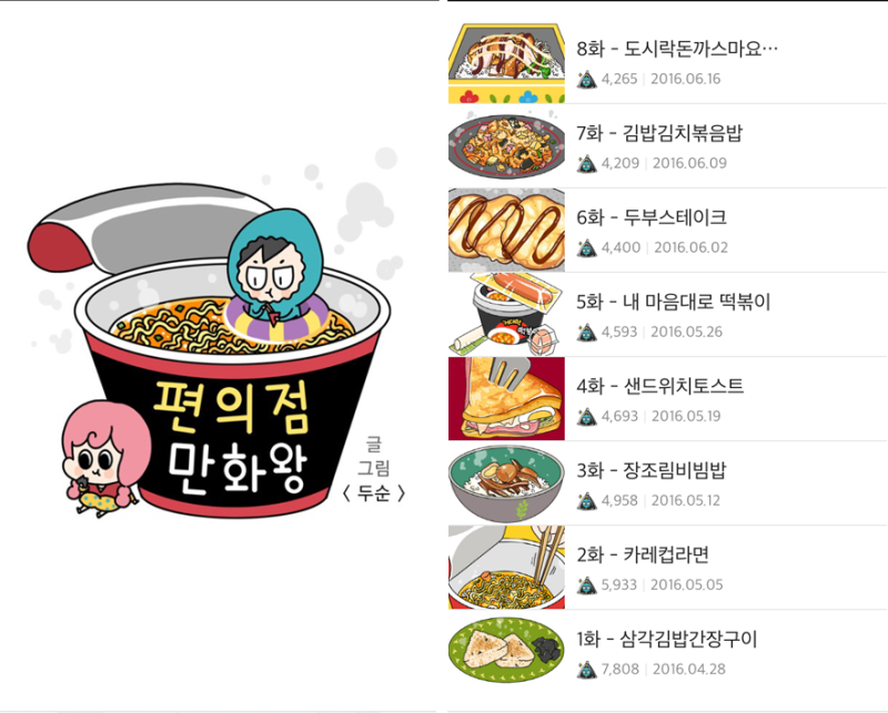- 편의점 만화왕 : 편의점 음식을 주제로 한 웹툰으로, 다양한 편의점 메뉴가 등장해요. 특히, 즉석에서 조리해 먹는 음식들이 많아서 흥미진진해요.